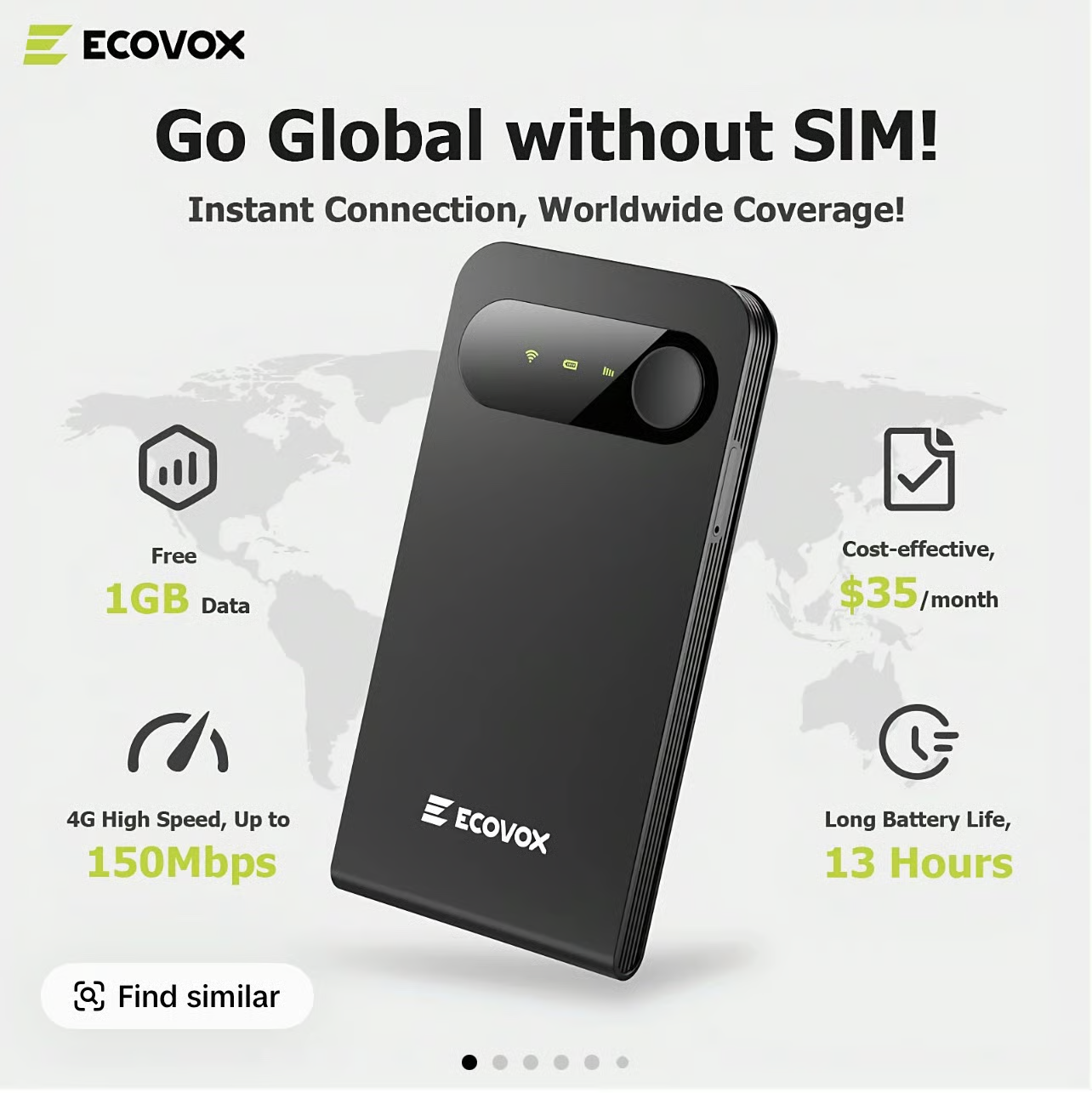 ECOVOX Global Portable WiFi Hotspot Stay Connected Abroad No SIM Needed 13-Hour Battery Connect 9 Devices at Once Perfect for Travel, Business & Study Abroad
